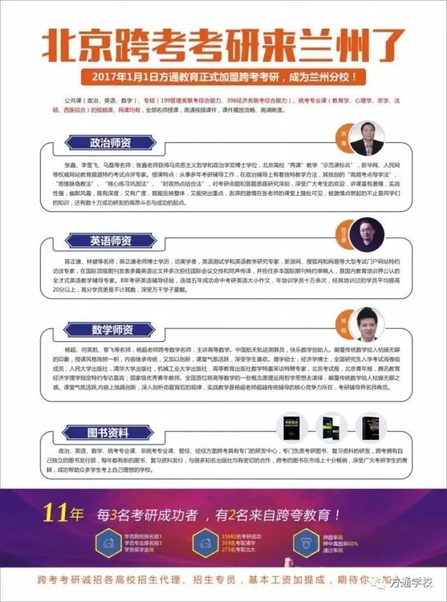 2017年1月1日方通教育正式加盟北京跨考考研,成为兰州分校!