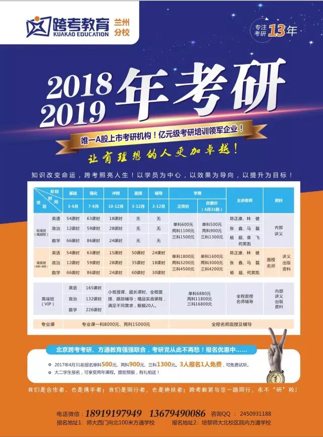 为感谢学员对跨考考研的信任和支持,2018年、2019年考研报名优惠报名延长一个月,优惠报名截止日期5月31日。