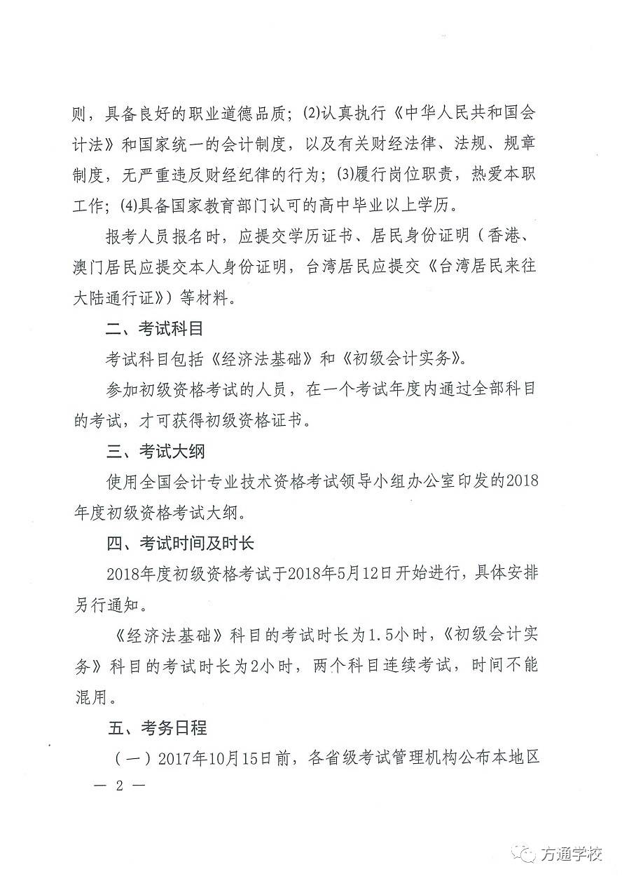 2017年10-12月、 2018年3-5月 星期五晚上、星期日早晨9:00-12:00,下午2:30-5:30 初级会实务、经济法